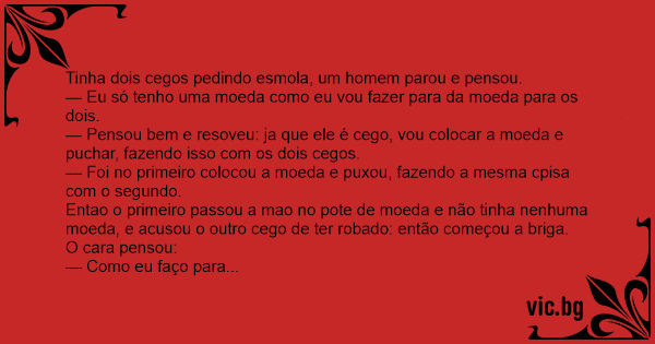 — Pensou bem e resoveu: ja que ele é cego, vou colocar a moeda e puchar, fazendo isso com os dois cegos.
