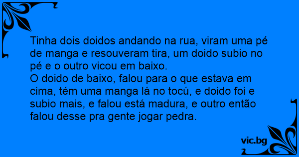 Tinha dois doidos andando na rua, viram uma pé de manga e resouveram tira, um doido subio no pé e o outro vicou em baixo.
