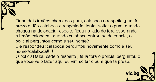 Tinha dois irmãos chamados pum, calaboca e respeito ,pum foi prezo então calaboca e respeito foi tentar soltar o pum, quando chegou na delegacia respeito ficou no lado de fora esperando o irmão calaboca , quando calaboca entrou na delegacia, o policial perguntou como é seu nome?
