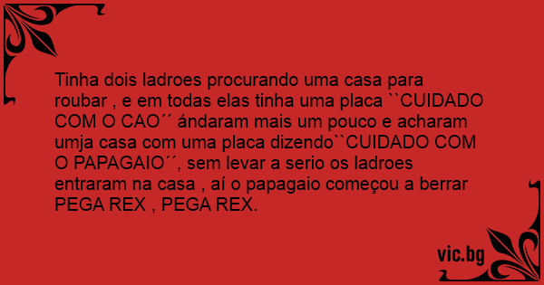 Tinha dois ladroes procurando uma casa para roubar , e em todas elas tinha uma placa ``CUIDADO COM O CAO´´ ándaram mais um pouco e acharam umja casa com uma placa dizendo``CUIDADO COM O PAPAGAIO´´, sem levar a serio os ladroes entraram na casa , aí o papagaio começou a berrar PEGA REX , PEGA REX.