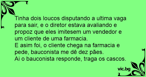 Tinha dois loucos disputando a ultima vaga para sair, e o diretor estava avaliando e propoz que eles imitesem um vendedor e um cliente de uma farmacia.