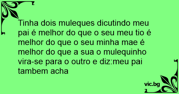 Tinha dois muleques dicutindo meu pai é melhor do que o seu meu tio é melhor do que o seu minha mae é melhor do que a sua o mulequinho vira-se para o outro e diz:meu pai tambem acha