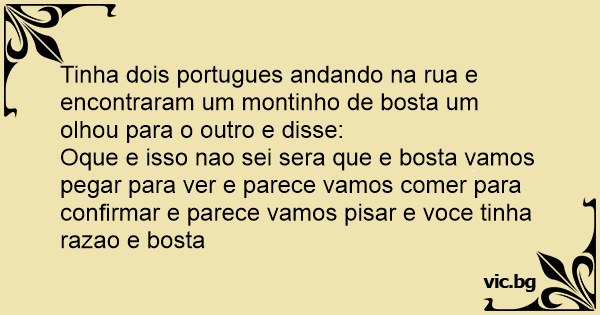 Tinha dois portugues andando na rua e encontraram um montinho de bosta um olhou para o outro e disse: