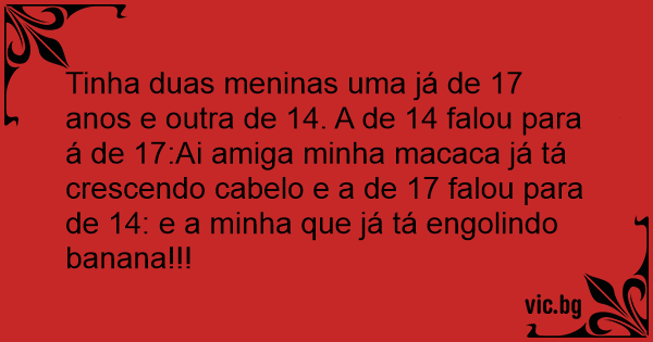 Tinha duas meninas uma já de 17 anos e outra de 14. A de 14 falou para á de 17:Ai amiga minha macaca já tá crescendo cabelo e a de 17 falou para de 14: e a minha que já tá engolindo banana!!!