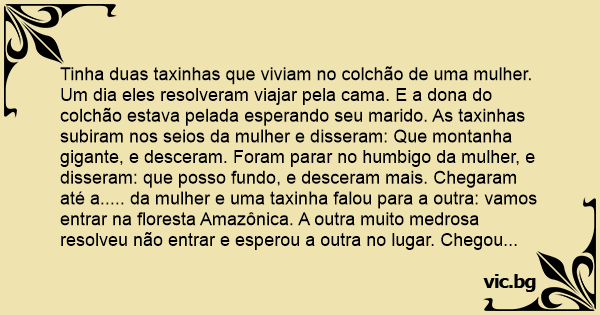 Tinha duas taxinhas que viviam no colchão de uma mulher. Um dia eles resolveram viajar pela cama. E a dona do colchão estava pelada esperando seu marido. As taxinhas subiram nos seios da mulher e disseram: Que montanha gigante, e desceram. Foram parar no humbigo da mulher, e disseram: que posso fundo, e desceram mais. Chegaram até a..... da mulher e uma taxinha falou para a outra: vamos entrar na floresta Amazônica. A outra muito medrosa resolveu não entrar e esperou a outra no lugar. Chegou o marido da mulher, tirou a roupa e fizeram sеxо bem gostoso. Quando terminaram, a taxinha que estava la dentro falou: Nossa não sei o que eu fiz para um careca com furo na testa me bater, e o outro respondeu: E eu que tive que carregar um saco de 500 Kilos nas costas!!!!