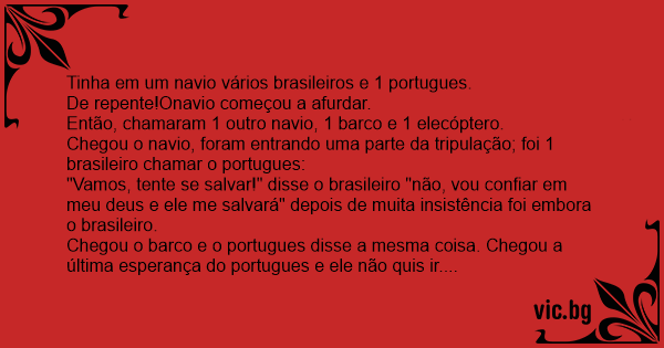 Foram todos embora e ficou só o portugues. O barco afundou e o portugues morreu afogado.