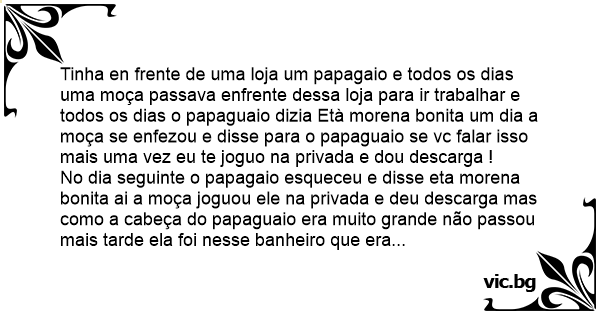 No dia seguinte o papagaio esqueceu e disse eta morena bonita ai a moça joguou ele na privada e deu descarga mas como a cabeça do papaguaio era muito grande não passou mais tarde ela foi nesse banheiro que era publico e não tinha teto ja era noite e a moça centou la para caguar e olhou para o cèu e disse que estrelas lindas e o papaguaio que estrelas ?