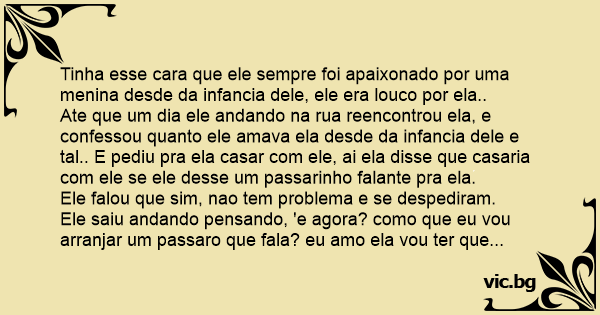 Tinha esse cara que ele sempre foi apaixonado por uma menina desde da infancia dele, ele era louco por ela.. Ate que um dia ele andando na rua reencontrou ela, e confessou quanto ele amava ela desde da infancia dele e tal.. E pediu pra ela casar com ele, ai ela disse que casaria com ele se ele desse um passarinho falante pra ela. Ele falou que sim, nao tem problema e se despediram. Ele saiu andando pensando, 'e agora? como que eu vou arranjar um passaro que fala? eu amo ela vou ter que arrumar alguma coisa'. Ele ainda tava andando na rua triste pensando, ate que ele ouviu uma vozinha ' oh fregues, entra aqui fregues. Ele olhou pros lados nao viu ninguem, continoou andando e escutou mais uma vez, ' oh fregues entra aqui'. Ai ele entrou na loja onde ele tinha ouvido a vozinha. E ele disse ' quem me chamou?'. E escutou a vozinha ' aqui em cima fregues'. Ele olhou e viu um passaro e disse ' voce fala passarinho?' Ai o passaro ' falo, falo sim senhor' e gritou ' oh negao, vem aqui negao, tem um fregues' Ai derrepente entra um negao grandao e fala ' que que tu quer aqui?' Ai o rapaz disse que ele queria comprar o passaro, que faria qualquer coisa, e explicou porque ele queria porque ele amava essa menina e tal. Ai o negao pensou e pensou e disse: bem vou te contar uma coisa, meu раu e muito grande entao nunca tive nada com ninguem, entao se vc deixar eu ter um lance, te dou o passarinho. O rapaz olhou assustado e pensou ' poxa e agora vou dar o cu pro cara, ah vou dar nunca mais vou ver a cara dele mesmo e eu vou conseguir o passarinho pra casar com a minha amada. O rapaz olhou pro negao e disse: tabem, mas vc tem que dar o passarinho na minha mao agora, pq sei la se vc me enganar. Ai o negao disse: ah claro espero que vou pegar ele. Ele pegou o passarinho da gaiola e deu pro rapaz. O rapaz abiaxou as calcas ai o negao pegou na cintura do rapaz e enfiou o раu dele. O rapaz gritou ahhhhhhhhhhhhhhhhhhhhhhhhhhhhhh. Ai o negou falou rapidamente: que foi? que foi? doeu? AI o rapaz disse: naoooooooo, esmaguei o passarinhooooooooo.