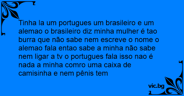 Tinha la um portugues um brasileiro e um alemao o brasileiro diz minha mulher é tao burra que não sabe nem escreve o nome o alemao fala entao sabe a minha não sabe nem ligar a tv o portugues fala isso nao é nada a minha comro uma caixa de camisinha e nem pênis tem