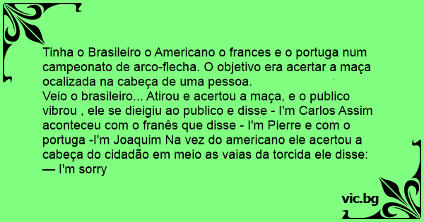 Tinha o Brasileiro o Americano o frances e o portuga num campeonato de arco-flecha. O objetivo era acertar a maça ocalizada na cabeça de uma pessoa.