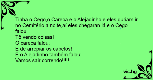Tinha o Cego,o Careca e o Alejadinho,e eles quriam ir no Cemitério a noite,aí eles chegaran lá e o Cego falou: