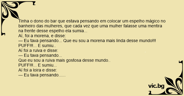 Tinha o dono do bar que estava pensando em colocar um espelho mágico no banheiro das mulheres, que cada vez que uma mulher falasse uma mentira na frente desse espelho ela sumia...
