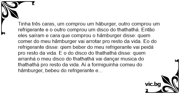 Tinha três caras, um comprou um hâburger, outro comprou um refrigerante e o outro comprou um disco do thathathá. Então eles saíram e cara que comprou o hâmburger disse: quem comer do meu hâmburger vai arrotar pro resto da vida. Eo do refrigerante disse: qiem beber do meu refrigerante vai peidá pro resto da vida. E o do disco do thathathá disse: quem arranhá o meu disco do thathathá vai dançar musica do thathathá pro resto da vida. Aí a formiguinha comeu do hâmburger, bebeu do refrigerante e arranhou o disco do thathathá. então eles voltaram e viram que tinham comido o hâmburger, bebido o refrigerante e arranhado o disco do thathathá. Aí veio a formiguinha fazendo hâ,pum,thathathá,hâ,pum,thathathá.