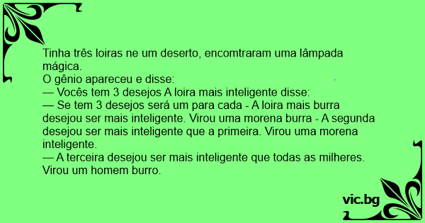— Se tem 3 desejos será um para cada - A loira mais burra desejou ser mais inteligente. Virou uma morena burra - A segunda desejou ser mais inteligente que a primeira. Virou uma morena inteligente.
