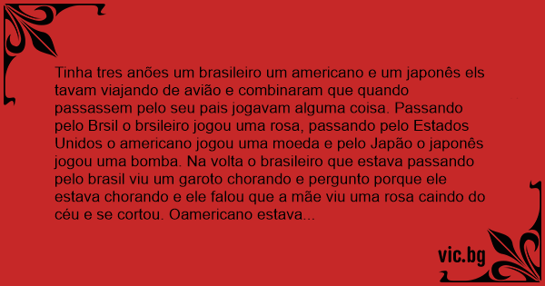 Tinha tres anões um brasileiro um americano e um japonês els tavam viajando de avião e combinaram que quando passassem pelo seu pais jogavam alguma coisa. Passando pelo Brsil o brsileiro jogou uma rosa, passando pelo Estados Unidos o americano jogou uma moeda e pelo Japão o japonês jogou uma bomba. Na volta o brasileiro que estava passando pelo brasil viu um garoto chorando e pergunto porque ele estava chorando e ele falou que a mãe viu uma rosa caindo do céu e se cortou. Oamericano estava passando pelo seu pais e vio um menino chorando e perguntou o motivo e o garoto respondeu porque seu pai viu dinhero caindo do ceu e bateu o carro e o japones estava passando pelo seu pais e viu o menino rindo e perguntou o motivo e le falou que ele tinha soltado um pum e a casa explodio.