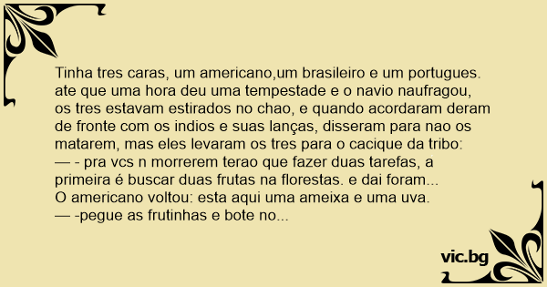 O americano encontrou o brasileiro no ceu, e o americano falou que tinha infiado a ameixa sem problemas, mas a uva quando foi infiada estorou e ele comecou a rir, e o indio cortou a cabeça, e vc brasileiro :
