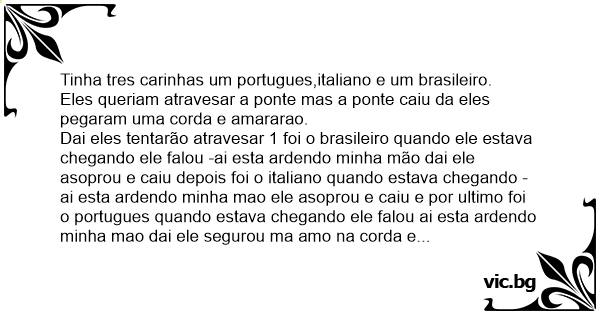 Dai eles tentarão atravesar 1 foi o brasileiro quando ele estava chegando ele falou -ai esta ardendo minha mão dai ele asoprou e caiu depois foi o italiano quando estava chegando -ai esta ardendo minha mao ele asoprou e caiu e por ultimo foi o portugues quando estava chegando ele falou ai esta ardendo minha mao dai ele segurou ma amo na corda e asopro uaoutra dai ele segurou a outra amo na corda e asoprou dai todo mundo falou portugues inteligente dai ele fez obrigago e soltou a mao da corda e caiu.