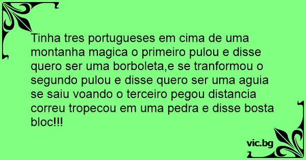 Tinha tres portugueses em cima de uma montanha magica o primeiro pulou e disse quero ser uma borboleta,e se tranformou o segundo pulou e disse quero ser uma aguia se saiu voando o terceiro pegou distancia correu tropecou em uma pedra e disse bosta bloc!!!