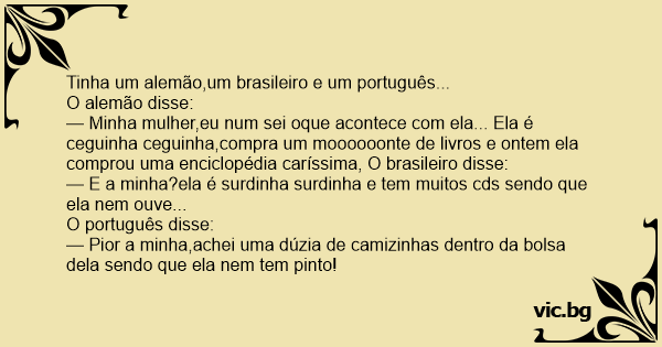 — Minha mulher,eu num sei oque acontece com ela... Ela é ceguinha ceguinha,compra um moooooonte de livros e ontem ela comprou uma enciclopédia caríssima, O brasileiro disse: