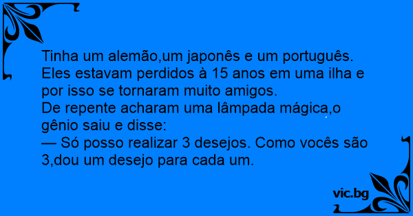Tinha um alemão,um japonês e um português. Eles estavam perdidos à 15 anos em uma ilha e por isso se tornaram muito amigos.