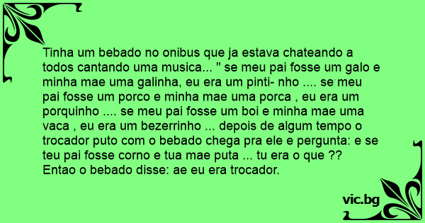 Tinha um bebado no onibus que ja estava chateando a todos cantando uma musica... " se meu pai fosse um galo e minha mae uma gаlinhа, eu era um pinti- nho .... se meu pai fosse um роrсо e minha mae uma роrса , eu era um porquinho .... se meu pai fosse um boi e minha mae uma vаса , eu era um bezerrinho ... depois de algum tempo o trocador рuто com o bebado chega pra ele e pergunta: e se teu pai fosse соrnо e tua mae рuта ... tu era o que ??