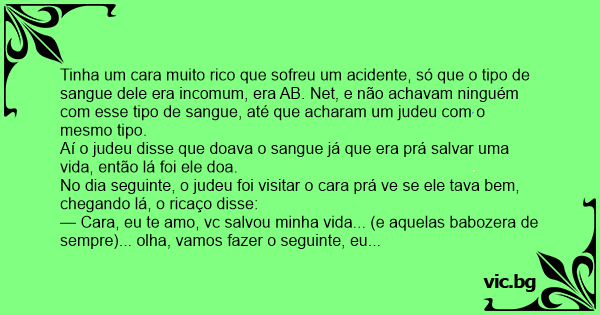 Tinha um cara muito rico que sofreu um acidente, só que o tipo de sangue dele era incomum, era AB. Net, e não achavam ninguém com esse tipo de sangue, até que acharam um judeu com o mesmo tipo.