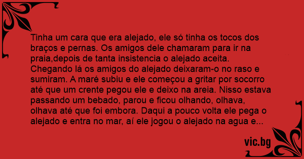 Tinha um cara que era alejado, ele só tinha os tocos dos braços e pernas. Os amigos dele chamaram para ir na praia,depois de tanta insistencia o alejado aceita. Chegando lá os amigos do alejado deixaram-o no raso e sumiram. A maré subiu e ele começou a gritar por socorro até que um crente pegou ele e deixo na areia. Nisso estava passando um bebado, parou e ficou olhando, olhava, olhava até que foi embora. Daqui a pouco volta ele pega o alejado e entra no mar, aí ele jogou o alejado na agua e disse: