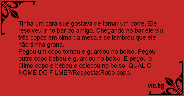 Pegou um copo tomou e guardou no bolso. Pegou outro copo bebeu e guardou no bolso. E pegou o útimo copo e bebeu e colocou no bolso. QUAL O NOME DO FILME?/Resposta:Robo copo.