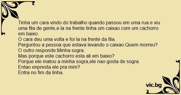 Tinha um cara vindo do trabalho quando passou em uma rua e viu uma fila de gente,e la na frente tinha um caixao com um сасhоrrо em baixo.