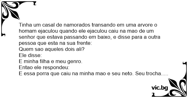 Tinha um casal de namorados transando em uma arvore o homam ejaculou quando ele ejaculou caiu na mao de um senhor que estava passando em baixo, e disse para a outra pessoa que esta na sua frente:
