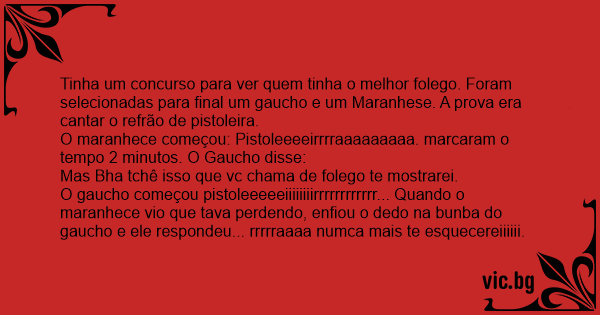 Tinha um concurso para ver quem tinha o melhor folego. Foram selecionadas para final um gaucho e um Maranhese. A prova era cantar o refrão de pistoleira.