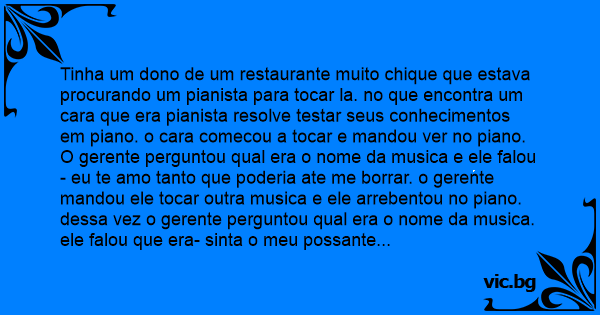 Tinha um dono de um restaurante muito chique que estava procurando um pianista para tocar la. no que encontra um cara que era pianista resolve testar seus conhecimentos em piano. o cara comecou a tocar e mandou ver no piano. O gerente perguntou qual era o nome da musica e ele falou- eu te amo tanto que poderia ate me borrar. o gerente mandou ele tocar outra musica e ele arrebentou no piano. dessa vez o gerente perguntou qual era o nome da musica. ele falou que era- sinta o meu possante musculo do sеxо, oh baby. Ai o cara se levantou e foi no banheiro, ele queria mijar. Qd voltou, esqueceu sua braguilha aberta e o gerente falou- sua braguilha esta aberta e seu pinto esta balancando. Ai o cara falou- essa ganhou o festival da cancao de 1972.