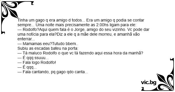 Tinha um gago q era amigo d todos... Era um amigo q podia se contar sempre... Uma noite mais precisamente as 2:00hs ligam para ele:
