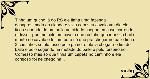Tinha um gucho lá do RS ele tinha uma fazenda desaprosimada da cidade e vivia com seu cavalo um dia ele ficou sabendo de um baile na cidade chegou en casa correndo e disse - guri me cele um cavalo que eu teho que ir nesse baile monto no cavalo e foi em bora só que pra chegar no baile tinha 3 caminhos se ele fosse pelo primeiro ele ia chegar no fim do baile e pelo segundo na metade do baile e pelo terseiro no .