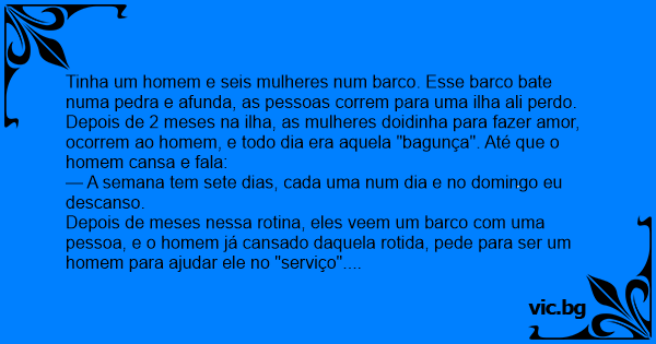 Depois de 2 meses na ilha, as mulheres doidinha para fazer amor, ocorrem ao homem, e todo dia era aquela "bagunça". Até que o homem cansa e fala: