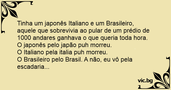 Tinha um japonês Italiano e um Brasileiro, aquele que sobrevivia ao pular de um prédio de 1000 andares ganhava o que queria toda hоrа.