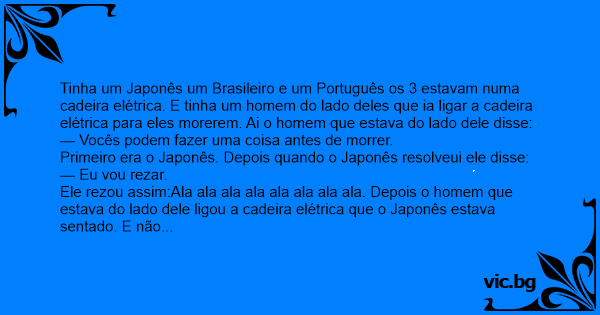 Tinha um Japonês um Brasileiro e um Português os 3 estavam numa cadeira elétrica. E tinha um homem do lado deles que ia ligar a cadeira elétrica para eles morerem. Ai o homem que estava do lado dele disse: