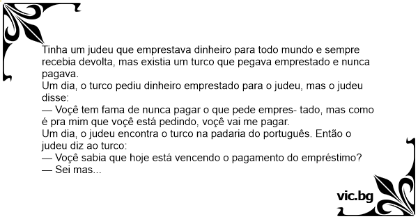 Tinha um judeu que emprestava dinheiro para todo mundo e sempre recebia devolta, mas existia um turco que pegava emprestado e nunca pagava.