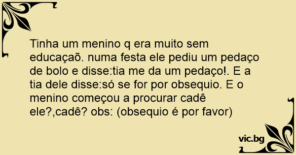 Tinha um menino q era muito sem educaçaõ. numa festa ele pediu um pedaço de bolo e disse:tia me da um pedaço!. E a tia dele disse:só se for por obsequio. E o menino começou a procurar cadê ele?,cadê? obs: (obsequio é por favor)
