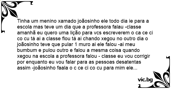 Tinha um menino xamado joãosinho ele todo dia ie para a escola mas teve um dia que a professora falau -classe amanhã eu quero uma lição para vcs escreverem o ca ce ci co cu tá ai a classe flou tá ai chando xegou no outro dia o joãosinho teve que pular 1 muro ai ele falou -ai meu bumbum e pulou outro e falou a mesma coisa quando xegou na escola a professora falou - classe eu vou corrigir por enquanto eu vou falar para as pessoas desatentas assim -joãosinho faala o c ce ci co cu para mim ele falou -ca ce ci co ai a prf falou-e o cu joãosinho ele falou -esqueci na serca