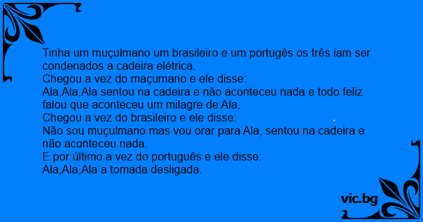 Tinha um muçulmano um brasileiro e um portugês os três iam ser condenados a cadeira elétrica.