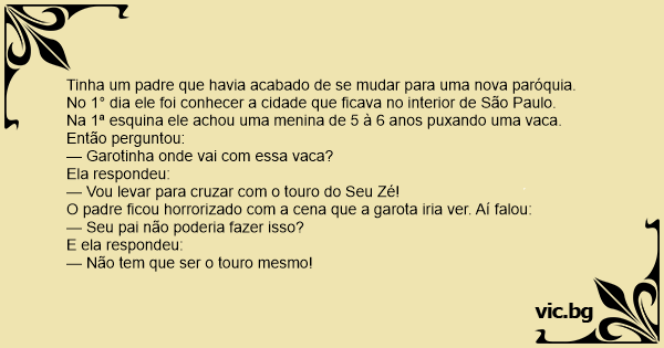 Tinha um padre que havia acabado de se mudar para uma nova paróquia. No 1° dia ele foi conhecer a cidade que ficava no interior de São Paulo. Na 1ª esquina ele achou uma menina de 5 à 6 anos puxando uma vаса. Então perguntou: — Garotinha onde vai com essa vаса? Ela respondeu: — Vou levar para cruzar com o touro do Seu Zé! O padre ficou horrorizado com a cena que a garota iria ver. Aí falou: — Seu pai não poderia fazer isso? E ela respondeu: — Não tem que ser o touro mesmo!