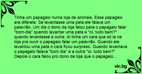 Tinha um papagaio numa loja de animais. Esse papagaio era diferete. Se levantasse uma pata ele falava um palavrão. Um dia o dono da loja falou para o papagaio falar "bom-dia" quando levantar uma pata e "oi, tudo bem?" quando levantasse a outra. Ai tinha um cara que só ia na loja pra ouvir o papagaio falar um palavrão. Quando ele levantou uma pata o cara ficou surpreso. Quando levantava o papagaio falava "bom dia" e a outra "oi, tudo bem?" Depois o cara falou pro dono da loja que o papagaio não falava mais palavrão. E perguntou o que o papagaio falaria quando levantasse as duas patas. E o papagaio: