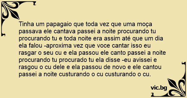 Tinha um papagaio que toda vez que uma moça passava ele cantava passei a noite procurando tu procurando tu e toda noite era assim até que um dia ela falou -aproxima vez que voce cantar isso eu rasgar o seu cu e ela passou ele canto passei a noite procurando tu procurado tu ela disse -eu avissei e rasgou o cu dele e ela passou de novo e ele cantou passei a noite custurando o cu custurando o cu.