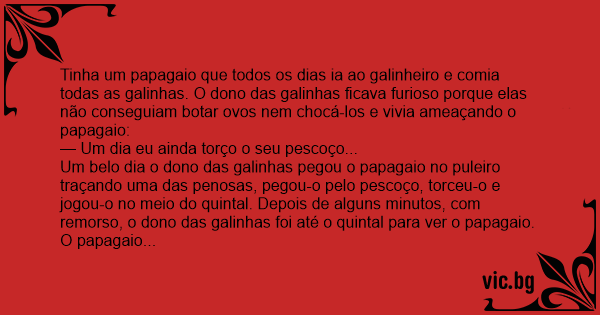 Tinha um papagaio que todos os dias ia ao galinheiro e comia todas as galinhas. O dono das galinhas ficava furioso porque elas não conseguiam botar ovos nem chocá-los e vivia ameaçando o papagaio:
