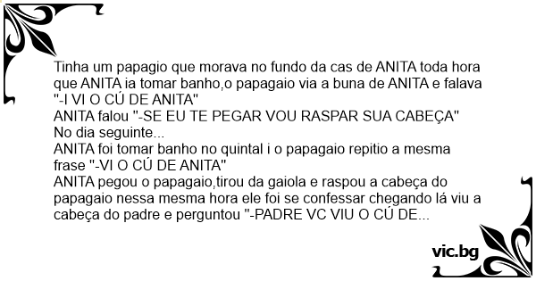 ANITA pegou o papagaio,tirou da gaiola e raspou a cabeça do papagaio nessa mesma hоrа ele foi se confessar chegando lá viu a cabeça do padre e perguntou ''-PADRE VC VIU O CÚ DE ANITA TAMBEM?''