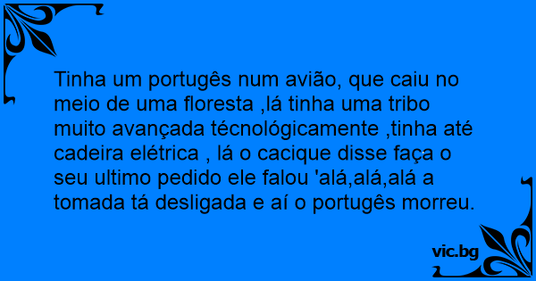 Tinha um portugês num avião, que caiu no meio de uma floresta ,lá tinha uma tribo muito avançada técnológicamente ,tinha até cadeira elétrica , lá o cacique disse faça o seu ultimo pedido ele falou 'alá,alá,alá a tomada tá desligada e aí o portugês morreu.