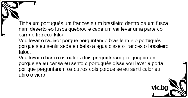 Tinha um português um frances e um brasileiro dentro de um fusca num deserto eo fusca quebrou e cada um vai levar uma parte do carro o frances falou: