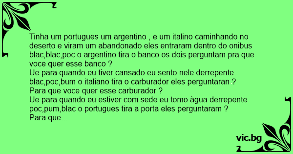 Tinha um portugues um argentino , e um italino caminhando no deserto e viram um abandonado eles entraram dentro do onibus blac,blac,poc o argentino tira o banco os dois perguntam pra que voce quer esse banco ?