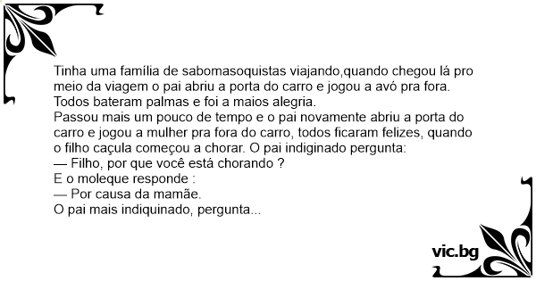 Tinha uma família de sabomasoquistas viajando,quando chegou lá pro meio da viagem o pai abriu a porta do carro e jogou a avó pra fora. Todos bateram palmas e foi a maios alegria.